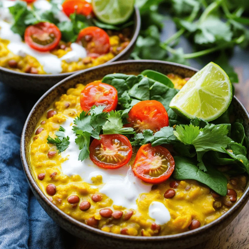 Servieren Sie das Linsencurry in tiefen Schalen. Träufeln Sie einen Schuss Kokosmilch darüber für ein hübsches Finish. Fügen Sie frischen Koriander oben drauf für Farbe und Aroma. Dazu passen Reis oder Naan-Brot sehr gut. Diese Beilagen machen das Gericht noch sättigender und runden das Essen ab.