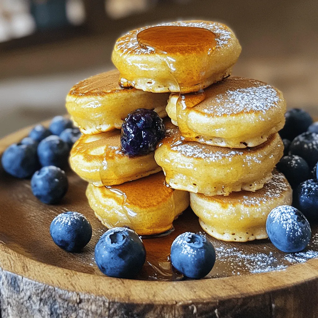 Serviere die Pfannkuchen-Bissen auf einem schönen Teller. Staple sie übereinander und stecke Zahnstochern hinein. Das sieht toll aus und macht das Essen leicht. Du kannst sie mit Ahornsirup oder Puderzucker toppen. Füge ein paar ganze Blaubeeren hinzu, um die Farben zu betonen. So wird dein Gericht noch lebendiger.