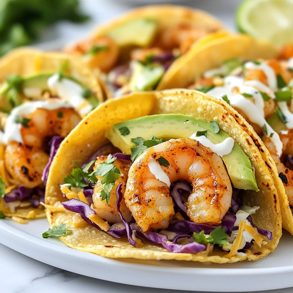 Leckere Tacos gefüllt mit würzigen Garnelen, frischem Gemüse und einer spritzigen Limettensauce.