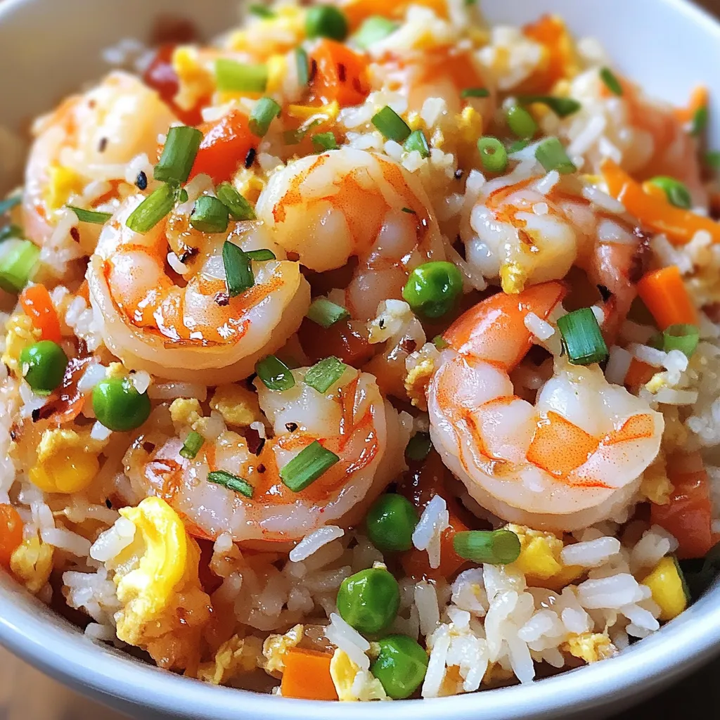 A flavorful fried rice dish with shrimp, garlic, and mixed vegetables.