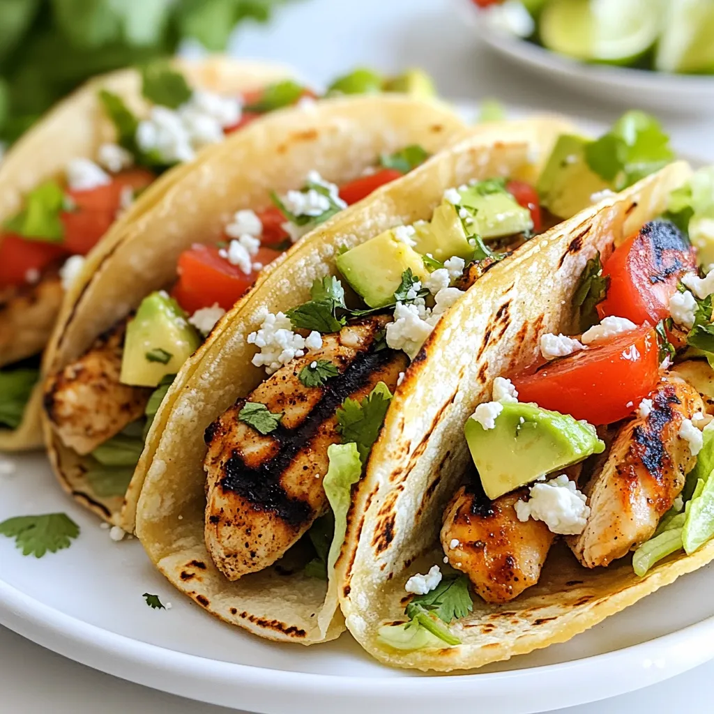 Leckere Tacos mit mariniertem Hähnchen, frischen Zutaten und einem Hauch von Limette.