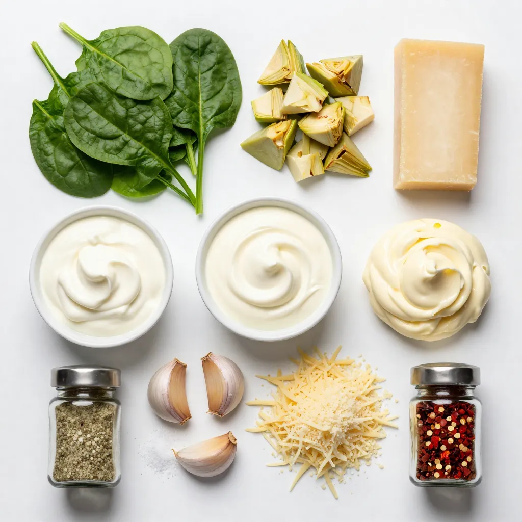 Für den cremigen Spinat-Artischocken-Dip benötigst du eine Mischung aus frischen und tiefgefrorenen Zutaten. Hier sind die Hauptbestandteile: