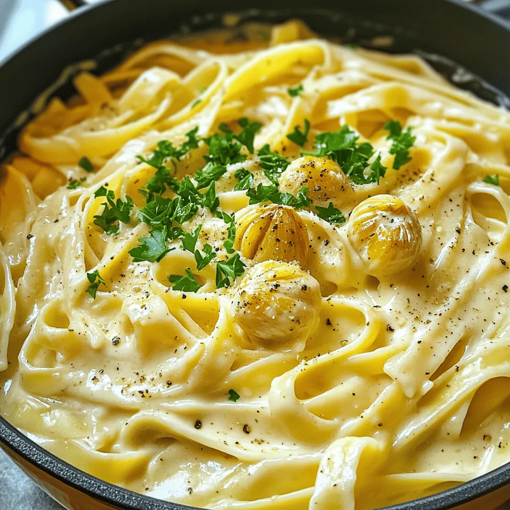 Knoblauch ist der Star dieses Gerichts. Röste ihn gut, um den süßen, reichen Geschmack zu entfalten. Wähle frischen Knoblauch, da er mehr Aroma hat. Achte darauf, die Fettuccine-Nudeln al dente zu kochen. Sie sollten weich, aber nicht matschig sein. Parmesan bringt viel Geschmack. Verwende frischen Parmesan für das beste Ergebnis. Gemüsebrühe gibt dem Gericht Tiefe. Du kannst auch selbstgemachte Brühe verwenden, wenn du Zeit hast.