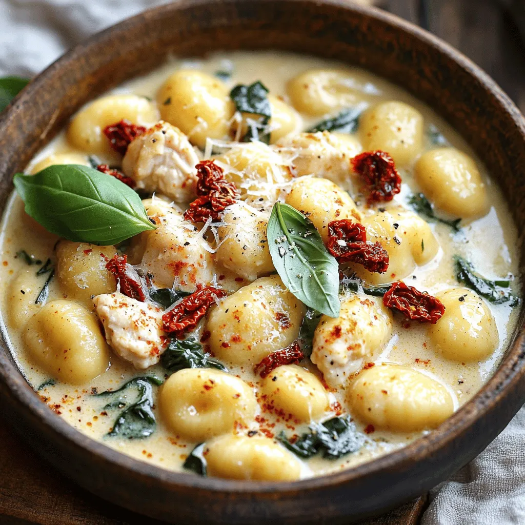 Um diese Gnocchi zu einer vegetarischen Mahlzeit zu machen, tauschen Sie das Hähnchen aus. Verwenden Sie stattdessen Champignons oder Zucchini. Sie bringen eine tolle Textur und Geschmack. Fügen Sie auch mehr Spinat oder andere Gemüse hinzu. Brokkoli oder Erbsen passen gut dazu. Diese Optionen machen das Gericht leicht und frisch.