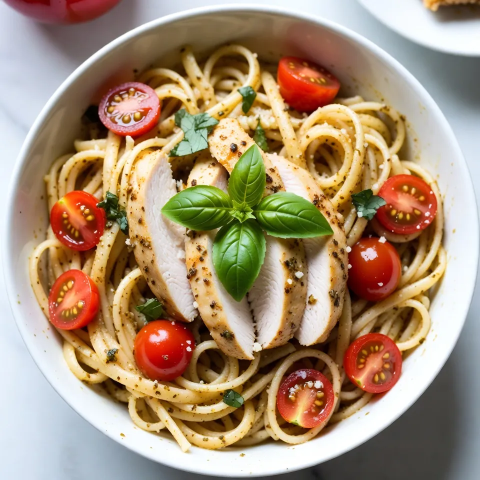 Eine köstliche Pasta mit cremiger Pestosauce und zartem Hühnchen.