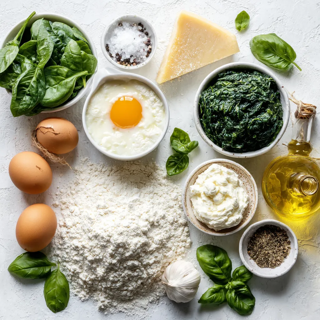 Diese Zutaten bilden die Basis für die Gnocchi. Der Spinat bringt frische Aromen, während der Ricotta für die Cremigkeit sorgt. Das Mehl und das Ei helfen, den Teig zu binden.