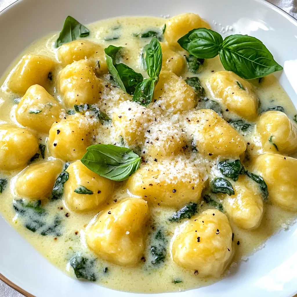 Für die cremigen Spinat-Ricotta-Gnocchi brauchst du: - 2 Tassen frischer Spinat, grob gehackt - 1 Tasse Ricotta-Käse - 1 Tasse Weizenmehl (plus extra zum Bestäuben) - 1 großes Ei - 1/2 Teelöffel Salz - 1/2 Teelöffel frisch geriebene Muskatnuss - 1/4 Tasse geriebener Parmesan-Käse Diese Zutaten bilden die Basis für die Gnocchi. Der Spinat bringt frische Aromen, während der Ricotta für die Cremigkeit sorgt. Das Mehl und das Ei helfen, den Teig zu binden. Zusätzlich benötigst du: - 2 Esslöffel Olivenöl - 2 Knoblauchzehen, fein gehackt - 1/2 Tasse Schlagsahne - Frisch gemahlener schwarzer Pfeffer nach Geschmack Das Olivenöl und der Knoblauch verleihen der Sauce Geschmack. Die Sahne macht die Sauce reichhaltig und cremig. Der schwarze Pfeffer sorgt für die nötige Würze. Für ein schönes Finish kannst du hinzufügen: - Frische Basilikumblätter zur Garnitur - Extra geriebener Parmesan-Käse Diese Toppings bringen Farbe und zusätzlichen Geschmack auf den Teller. Die frischen Basilikumblätter machen das Gericht besonders ansprechend. {{ingredient_image_2}} Um den Gnocchi-Teig herzustellen, beginne mit einer großen Schüssel. Füge den grob gehackten Spinat, Ricotta-Käse, Mehl, Ei, Salz und Muskatnuss hinzu. Mische alles gut, bis ein weicher, leicht klebriger Teig entsteht. Wenn der Teig zu feucht ist, gebe löffelweise mehr Mehl dazu. Du möchtest, dass der Teig gut formbar ist. Bestäube eine saubere Arbeitsfläche mit etwas Mehl. Teile den Teig in vier gleich große Portionen. Rolle jede Portion zu einem langen Strang von etwa 1,5 cm Dicke. Schneide die Stränge in 2,5 cm lange Stücke. Mit einer Gabel drücke Rillen in jedes Stück. Diese Rillen helfen, die Sauce besser zu halten. Koche in einem großen Topf Salzwasser, bis es sprudelt. Lasse die Gnocchi vorsichtig in das kochende Wasser gleiten. Koche sie, bis sie an die Oberfläche schwimmen, was etwa 2-3 Minuten dauert. Verwende einen Schaumlöffel, um die Gnocchi vorsichtig herauszunehmen und lege sie auf einen Teller. Erhitze in einer großen Pfanne bei mittlerer Hitze das Olivenöl und den gehackten Knoblauch. Sauté den Knoblauch für etwa 30 Sekunden, bis er duftet. Gieße die Schlagsahne dazu und lasse sie 2-3 Minuten köcheln. Rühre den geriebenen Parmesan-Käse ein, bis er geschmolzen ist und die Sauce glatt wird. Schmecke die Sauce mit Salz und frisch gemahlenem schwarzem Pfeffer ab. Gib die gekochten Gnocchi in die Pfanne mit der Sahnesauce. Wende sie vorsichtig, bis sie gleichmäßig mit der Sauce überzogen sind. Erwärme alles für weitere 2 Minuten zusammen. Richte die cremigen Spinat-Ricotta-Gnocchi auf Tellern an. Garniere sie mit frischen Basilikumblättern und etwas extra geriebenem Parmesan-Käse, wenn du magst. Um einen tollen Gnocchi-Teig zu machen, ist die richtige Mischung wichtig. Du musst frischen Spinat, Ricotta, Mehl, Ei, Salz und Muskatnuss gut vermengen. Achte darauf, dass der Teig weich, aber nicht zu klebrig ist. Falls er zu feucht ist, füge löffelweise mehr Mehl hinzu. So erreichst du die ideale Konsistenz. Für das Kochen der Gnocchi benutze einen großen Topf mit Salzwasser. Warte, bis das Wasser sprudelt. Gib die Gnocchi vorsichtig hinein und koche sie, bis sie an die Oberfläche schwimmen. Das dauert etwa 2-3 Minuten. Benutze einen Schaumlöffel, um die Gnocchi herauszunehmen. So bleiben sie ganz und lecker. Um die Sahnesauce zu verbessern, verwende frischen Knoblauch. Er verleiht der Sauce ein tolles Aroma. Lass den gehackten Knoblauch in Olivenöl anbraten, bis er duftet. Füge dann die Schlagsahne und Parmesan hinzu. Rühre alles gut um, damit die Sauce schön cremig wird. Schmecke sie mit Salz und Pfeffer ab. Die Gnocchi sehen auf dem Teller noch besser aus, wenn du sie mit frischem Basilikum garnierst. Du kannst auch etwas extra Parmesan darüber streuen. Ein paar bunte Tomatenscheiben oder ein Spritzer Olivenöl verleihen deinem Gericht das gewisse Etwas. So wird jede Portion zum Hingucker. Pro Tipps Frischer Spinat: Verwenden Sie frischen Spinat anstelle von gefrorenem, um den besten Geschmack und die beste Textur zu erzielen. Gnocchi nicht überkochen: Achten Sie darauf, die Gnocchi nur so lange zu kochen, bis sie an die Oberfläche schwimmen, um eine zähe Konsistenz zu vermeiden. Richtige Mehlmenge: Fügen Sie das Mehl nach Bedarf hinzu, um sicherzustellen, dass der Teig nicht zu trocken oder zu klebrig ist. Parmesan hinzufügen: Fügen Sie den geriebenen Parmesan langsam zur Sauce hinzu, damit er gleichmäßig schmilzt und eine cremige Konsistenz erzielt wird. {{image_4}} Wenn du ein vegetarisches Gericht möchtest, hast du viele Optionen. Du kannst einfach auf Fleisch verzichten. Nutze mehr Gemüse, um Geschmack zu bringen. Zucchini oder Pilze passen gut zu deinem Gericht. Sie fügen Textur und Aroma hinzu. Du kannst auch Erbsen oder Süßkartoffeln hinzufügen. Diese machen die Gnocchi noch bunter und schmackhafter. Ricotta ist großartig, aber nicht die einzige Wahl. Du kannst auch Mascarpone oder Feta verwenden. Mascarpone macht die Gnocchi noch cremiger. Feta bringt eine salzige Note mit. Experimentiere mit verschiedenen Käsesorten, um neue Geschmäcker zu entdecken. Achte darauf, die Mengen anzupassen, um die richtige Konsistenz zu behalten. Für eine glutenfreie Option kannst du glutenfreies Mehl nutzen. Es gibt viele Mischungen auf dem Markt. Achte darauf, dass du ein Mehl wählst, das für Pasta geeignet ist. Du kannst auch Kartoffelmehl verwenden. Damit werden die Gnocchi leicht und luftig. Wenn du diese Alternativen verwendest, teste den Teig. So stellst du sicher, dass er die richtige Konsistenz hat. Du kannst die Gnocchi leicht einfrieren. Lege die rohen Gnocchi auf ein Backblech. Achte darauf, dass sie sich nicht berühren. Friere sie für etwa 30 Minuten ein. Danach kannst du sie in einen Gefrierbeutel geben. So bleiben sie frisch bis zu drei Monate. Wenn du sie kochen möchtest, koche sie direkt aus dem Gefrierfach. Falls du Gnocchi übrig hast, bewah