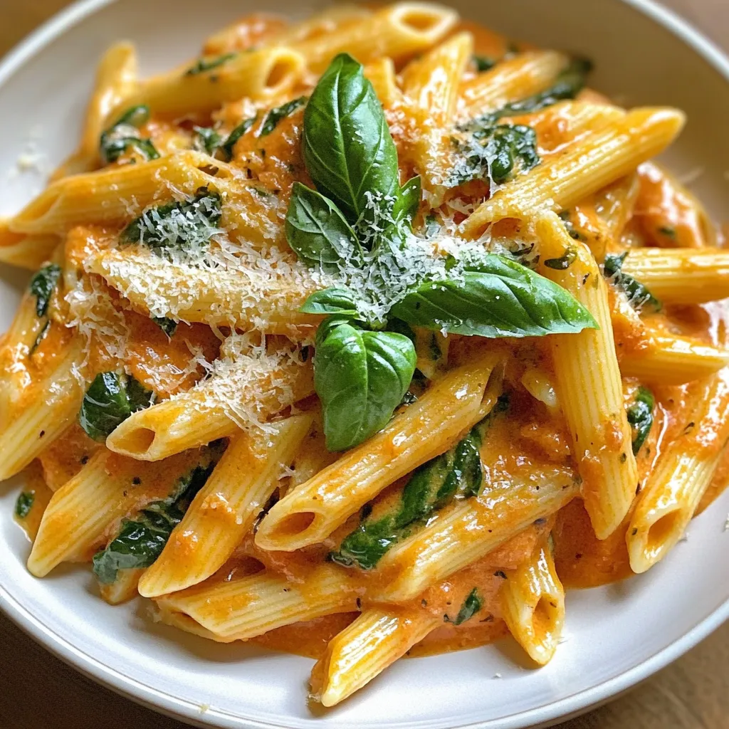 • Die cremige Tomaten-Spinat-Penne anrichten und mit frischen Basilikumblättern garnieren, um ein aromatisches Finish zu verleihen.