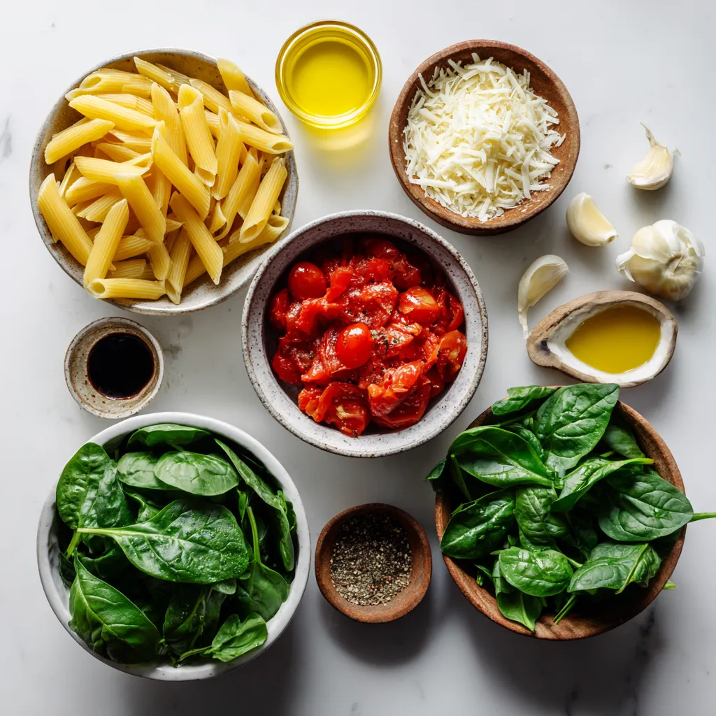 Um diese leckere cremige Tomaten-Spinat-Penne zuzubereiten, brauchst du einige Hauptzutaten. Hier sind sie:
