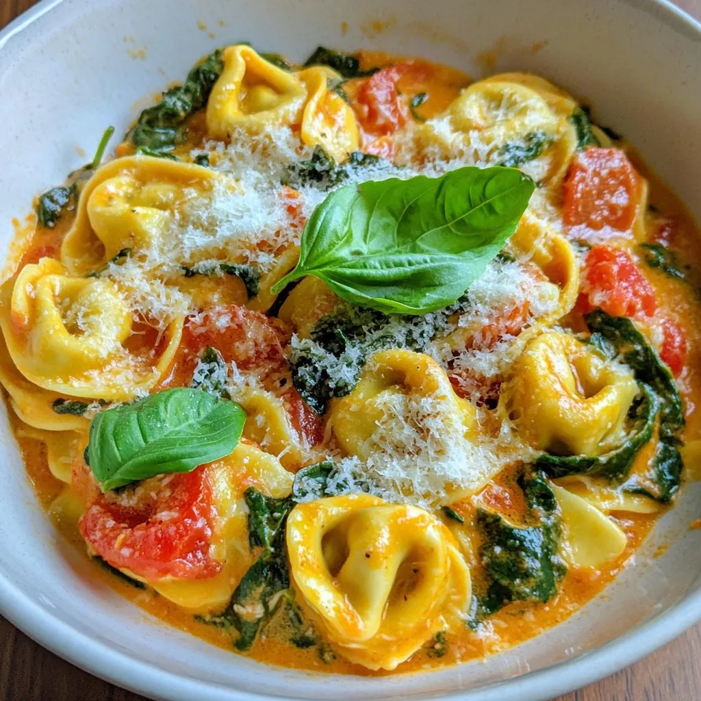 Ein köstliches Gericht mit Käse-Tortellini in einer cremigen Tomaten-Spinat-Sauce.