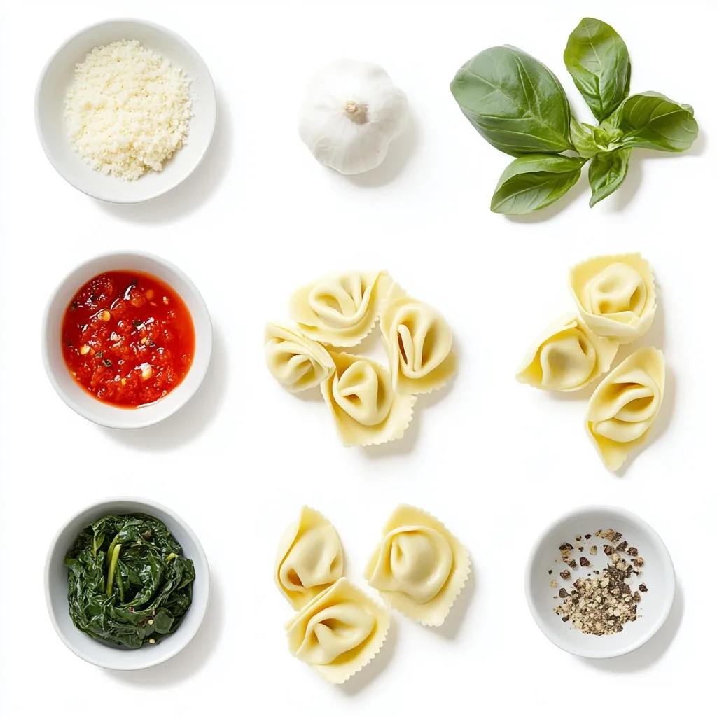 Hauptzutaten für die cremige Tomaten-Spinat Tortellini