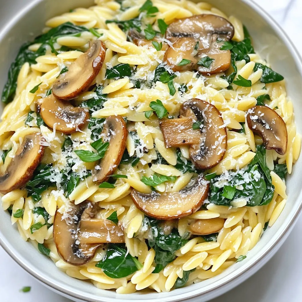 Ein cremiges und herzhaftes Gericht mit Orzo, Pilzen und Spinat.