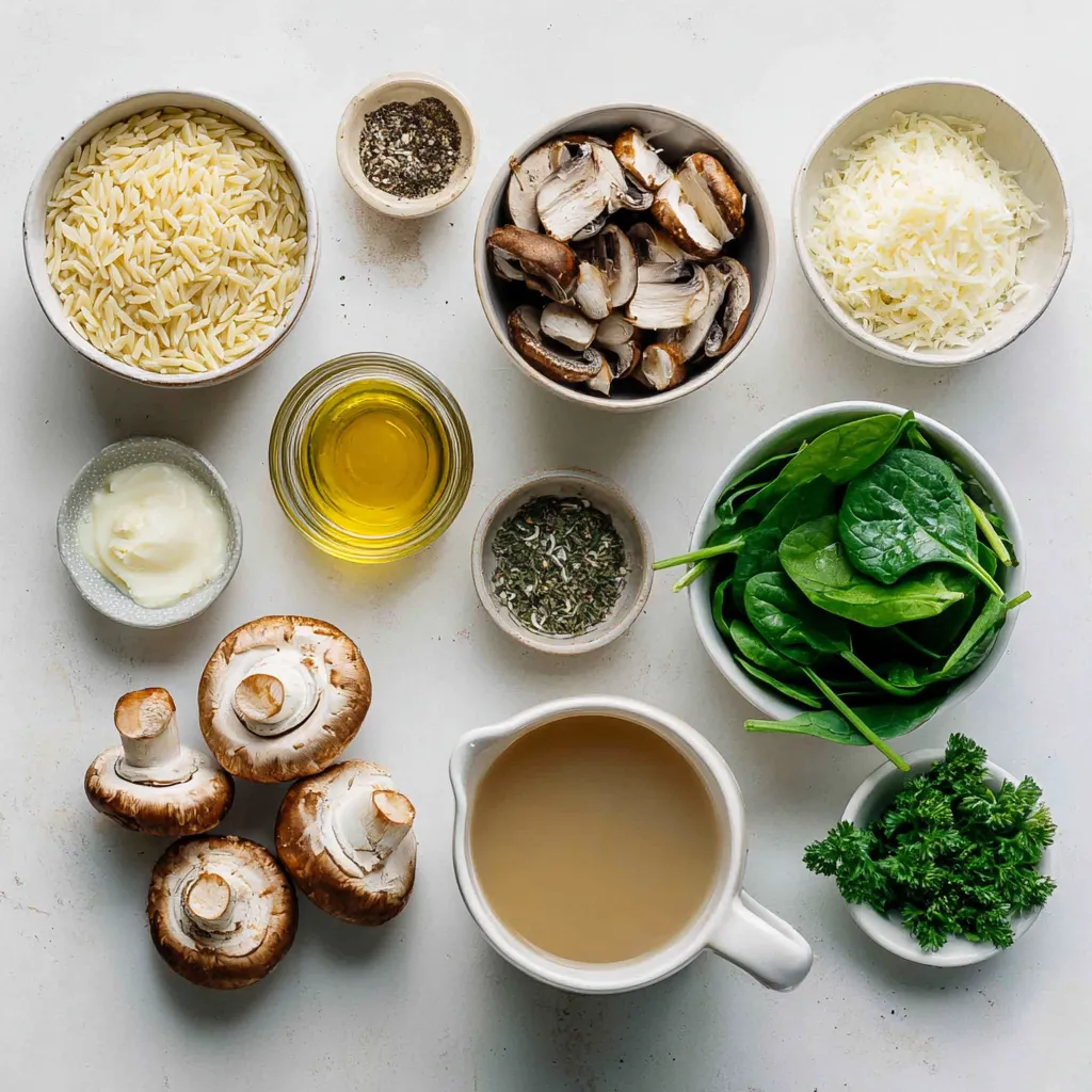 Für diesen leckeren Pilz-Spinat-Orzo brauchen wir einige Hauptzutaten. Diese Zutaten geben dem Gericht seinen tollen Geschmack und die cremige Textur. Hier sind die Zutaten: