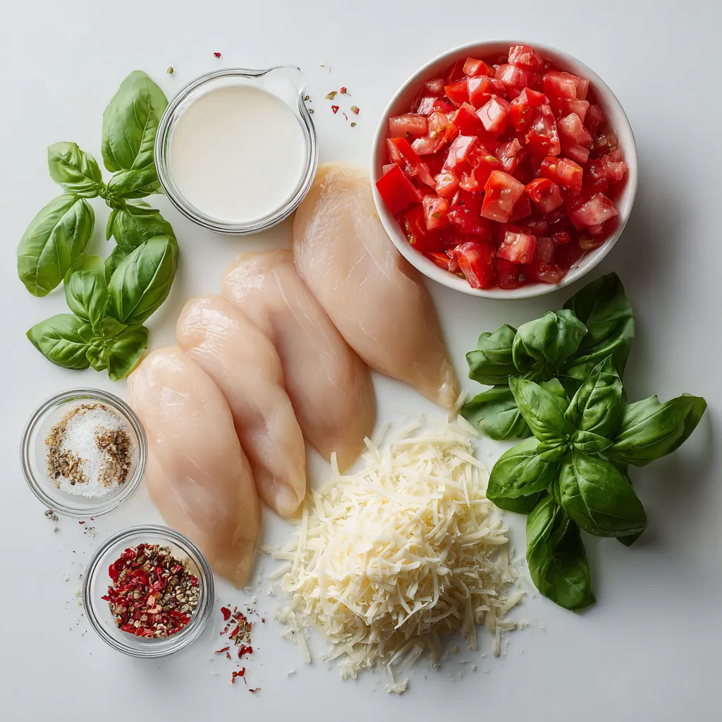 Hauptzutaten für cremiges Tomaten-Basilikum-Hähnchen