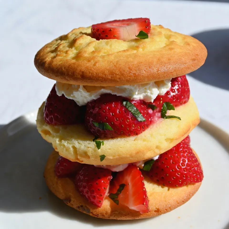 Ein köstlicher Shortcake mit frischen Erdbeeren und Basilikum.
