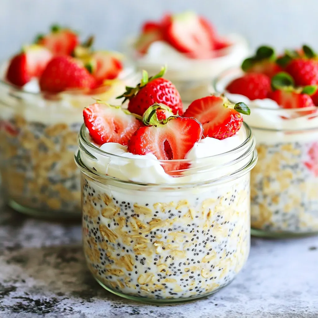 Für diese leckeren Erdbeer Cheesecake Overnight Oats benötigst du nur einige einfache Zutaten. Hier sind die Hauptbestandteile: - 1 Tasse Haferflocken - 1 ½ Tassen Mandelmilch (oder Milch nach Wahl) - ½ Tasse griechischer Joghurt (natur oder Vanille) - 2 Esslöffel Frischkäse, weichgeklopft - 2 Esslöffel Ahornsirup (oder Honig) - 1 Teelöffel Vanilleextrakt - ½ Tasse frische Erdbeeren, grob gehackt (plus extra zum Garnieren) - 1 Esslöffel Chia-Samen - Eine Prise Salz Jede Zutat hat ihren eigenen Zweck. Die Haferflocken machen das Frühstück sättigend. Der Joghurt und der Frischkäse geben eine cremige Textur. Die Erdbeeren bringen fruchtige Süße. Du kannst verschiedene Milch- und Joghurtarten wählen. Mandelmilch ist leicht und nussig. Kuhmilch gibt einen reicheren Geschmack. Auch Hafer- oder Sojamilch sind gute Optionen. Für den Joghurt kannst du griechischen Joghurt verwenden. Naturjoghurt ist eine tolle, weniger süße Wahl. Vanillejoghurt fügt einen Hauch von Süße hinzu. Wenn du eine andere Süße bevorzugst, gibt es viele Optionen. Honig ist eine beliebte Wahl. Agavendicksaft ist eine gute, vegane Alternative. Kokoszucker gibt einen karamelligen Geschmack. Du kannst auch ein wenig Zucker oder Stevia verwenden. Achte darauf, die Menge anzupassen, um die Süße nach deinem Geschmack zu treffen. Um die Erdbeer Cheesecake Overnight Oats zuzubereiten, brauchst du frische und leckere Zutaten. Hier ist, was du benötigst: - 1 Tasse Haferflocken - 1 ½ Tassen Mandelmilch (oder Milch nach Wahl) - ½ Tasse griechischer Joghurt (natur oder Vanille) - 2 Esslöffel Frischkäse, weichgeklopft - 2 Esslöffel Ahornsirup (oder Honig) - 1 Teelöffel Vanilleextrakt - ½ Tasse frische Erdbeeren, grob gehackt (plus extra zum Garnieren) - 1 Esslöffel Chia-Samen - Eine Prise Salz Stelle sicher, dass alle Zutaten frisch sind. Das macht einen großen Unterschied im Geschmack. Zuerst nimm eine mittelgroße Schüssel. Gib die Haferflocken, Mandelmilch, griechischen Joghurt, Frischkäse, Ahornsirup, Vanilleextrakt, Chia-Samen und die Prise Salz hinein. Rühre alles gut um. Achte darauf, dass der Frischkäse keine Klumpen hat. Wenn alles gut vermischt ist, füge die gehackten Erdbeeren hinzu. Hebe sie vorsichtig unter die Mischung, damit sie nicht zerdrückt werden. Jetzt verteile die Mischung gleichmäßig auf zwei Gläser oder Behälter. Verschließe die Gläser mit Deckeln. Stelle sie dann über Nacht oder für mindestens 6 Stunden in den Kühlschrank. So weichen die Haferflocken ein und werden weich. Am Morgen rühre die Oats nochmal gut um. Du kannst sie mit extra gehackten Erdbeeren und einem Schuss Ahornsirup garnieren. Kalt servieren und genießen! Diese Overnight Oats sind perfekt für ein schnelles und erfrischendes Frühstück zum Mitnehmen. Um die perfekte Konsistenz zu erreichen, mische die Haferflocken mit der Mandelmilch und dem Joghurt gründlich. Achte darauf, dass der Frischkäse gut eingearbeitet ist. Die Chia-Samen helfen, die Mischung zu binden. Lass die Oats über Nacht im Kühlschrank stehen. So saugen die Haferflocken die Flüssigkeit auf und werden weich. Wenn du eine cremigere Textur magst, füge mehr Joghurt hinzu. Wähle frische, reife Erdbeeren aus. Achte darauf, dass sie fest und saftig sind. Vermeide weich oder matschig aussehende Beeren. Lagere sie im Kühlschrank, aber nicht in Plastik. Ein Papiertuch in der Schale hilft, Feuchtigkeit zu absorbieren. So bleiben sie länger frisch. Wasche die Erdbeeren erst kurz vor der Verwendung, um ihre Haltbarkeit zu verlängern. Um den Geschmack zu variieren, probiere andere Früchte wie Himbeeren oder Blaubeeren. Du kannst auch Nüsse oder Samen hinzufügen, um mehr Crunch zu bekommen. Eine Prise Zimt oder etwas Kakaopulver bringt zusätzliche Tiefe. Für eine noch reichhaltigere Note, verwende etwas mehr Frischkäse oder griechischen Joghurt. Experimentiere mit verschiedenen Süßungsmitteln, um die perfekte Balance zu finden. {{image_4}} Um eine vegane Version der Erdbeer Cheesecake Overnight Oats zu machen, ersetzen Sie den Frischkäse. Verwenden Sie stattdessen veganen Frischkäse oder pürierte Cashews. Diese Zutaten geben der Mischung eine cremige Textur. Sie können auch pflanzlichen Joghurt verwenden. Mandel- oder Kokosjoghurt sind tolle Optionen. Fügen Sie Ihrer Mischung andere Früchte hinzu. Bananen, Heidelbeeren oder Pfirsiche passen gut zu den Haferflocken. Schneiden Sie die Früchte klein, damit sie leichter vermischt werden. Auch gefrorene Früchte sind eine gute Wahl. Diese sind oft süßer und geben einen frischen Geschmack. Um die Overnight Oats proteinreicher zu machen, fügen Sie Proteinpulver hinzu. Ein Esslöffel Vanille- oder Erdbeergeschmack passt gut. Eine weitere Möglichkeit ist, mehr griechischen Joghurt zu verwenden. Dies erhöht den Proteingehalt und macht die Oats noch cremiger. Chia-Samen sind auch eine tolle Ergänzung, da sie Ballaststoffe und Proteine bieten. Du solltest deine Erdbeer Cheesecake Overnight Oats immer im Kühlschrank lagern. Die Mischung in dicht schließenden Gläsern hält sich gut. So bleiben die Oats frisch und lecker. Stelle sicher, dass die Gläser gut verschlossen sind, um die Aromen zu bewahren. Die Overnight Oats sind bis zu fünf Tage haltbar. Nach dem ersten Tag schmecken sie sogar noch besser. Die Aromen können sich schön verbinden. Ich empfehle, sie innerhalb von drei bis fünf Tagen zu essen. So sind sie frisch und lecker. Wenn du eine größere Menge zubereitest, kannst du die Oats auch einfrieren. Fülle sie in luftdichte Behälter und friere sie ein. So hast du immer eine schnelle Mahlzeit. Zum Aufwärmen nimm die Oats einfach über Nacht aus dem Gefrierfach. Lass sie im Kühlschrank auftauen. Am Morgen kannst du sie dann genießen! Du kannst Erdbeer Cheesecake Overnight Oats bis zu 3 Tage im Kühlschrank aufbewahren. Achte darauf, die Gläser gut zu verschließen, damit sie frisch bleiben. Nach ein paar Tagen könnte die Konsistenz etwas weicher werden, 