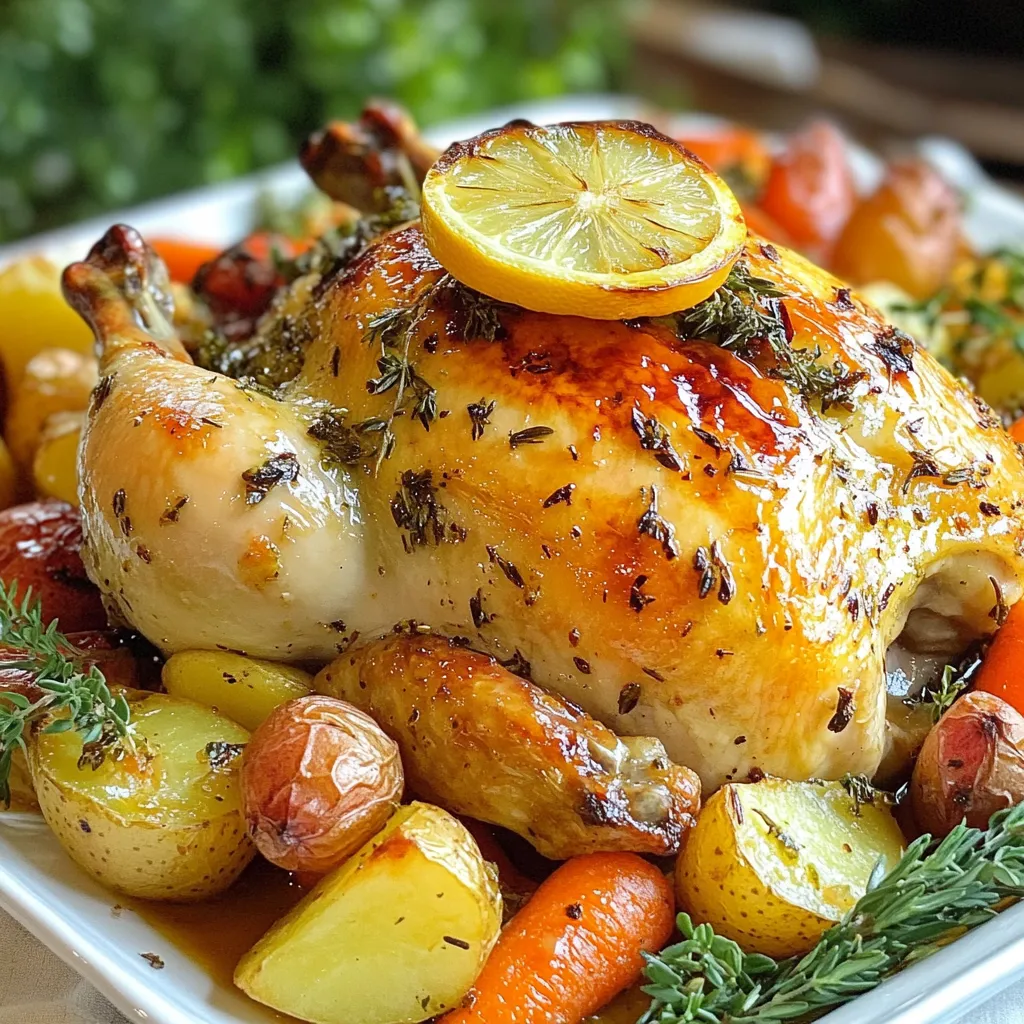 Ein saftiges Hühnchen, mariniert mit aromatischen Kräutern und Knoblauch, perfekt geröstet mit Wurzelgemüse.