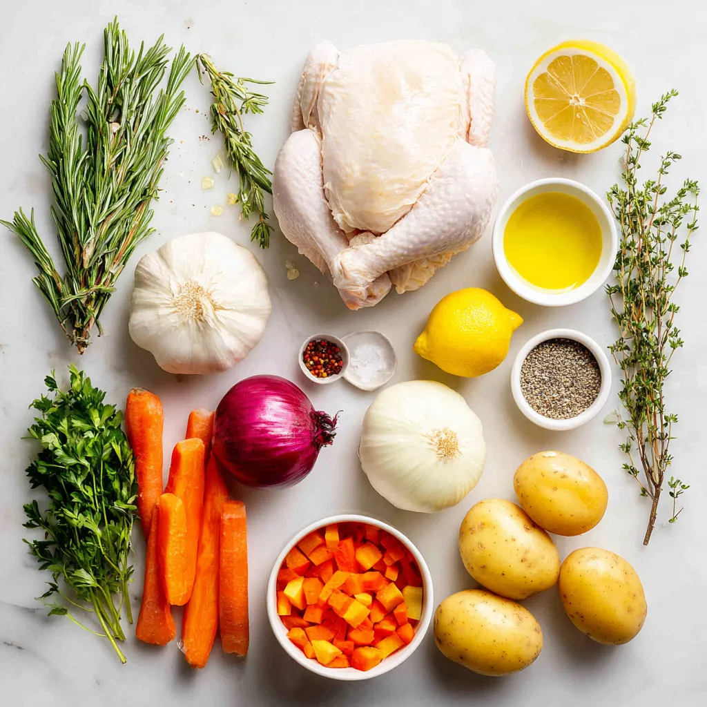 Hauptzutaten für das Knoblauch-Kräuter-Rösthühnchen