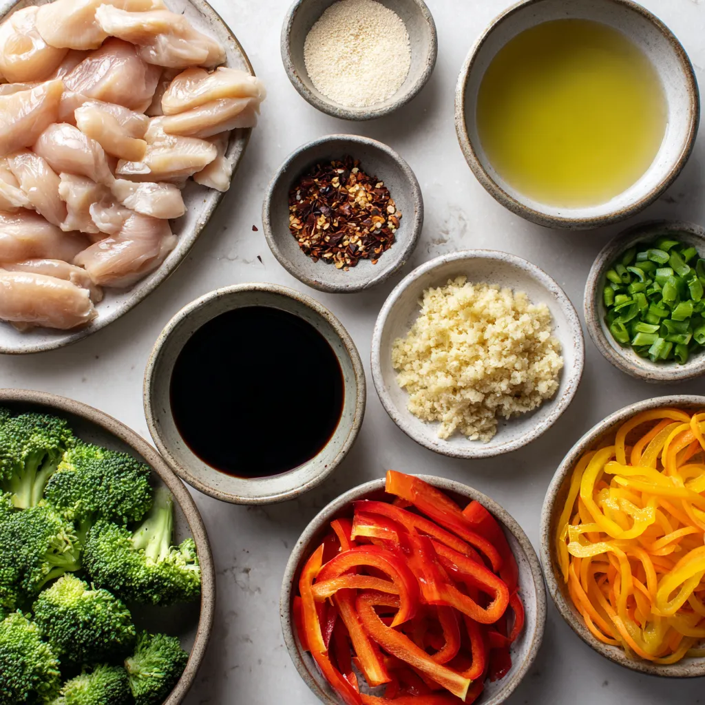 In diesem Rezept sind die Zutaten einfach und frisch. Ich benutze gerne Hähnchenbrust, weil sie schnell gar wird. Paprika bringt Farbe und Geschmack. Brokkoli ist gesund und gibt einen schönen Crunch. Die Karotte sorgt für Süße und eine tolle Textur.
