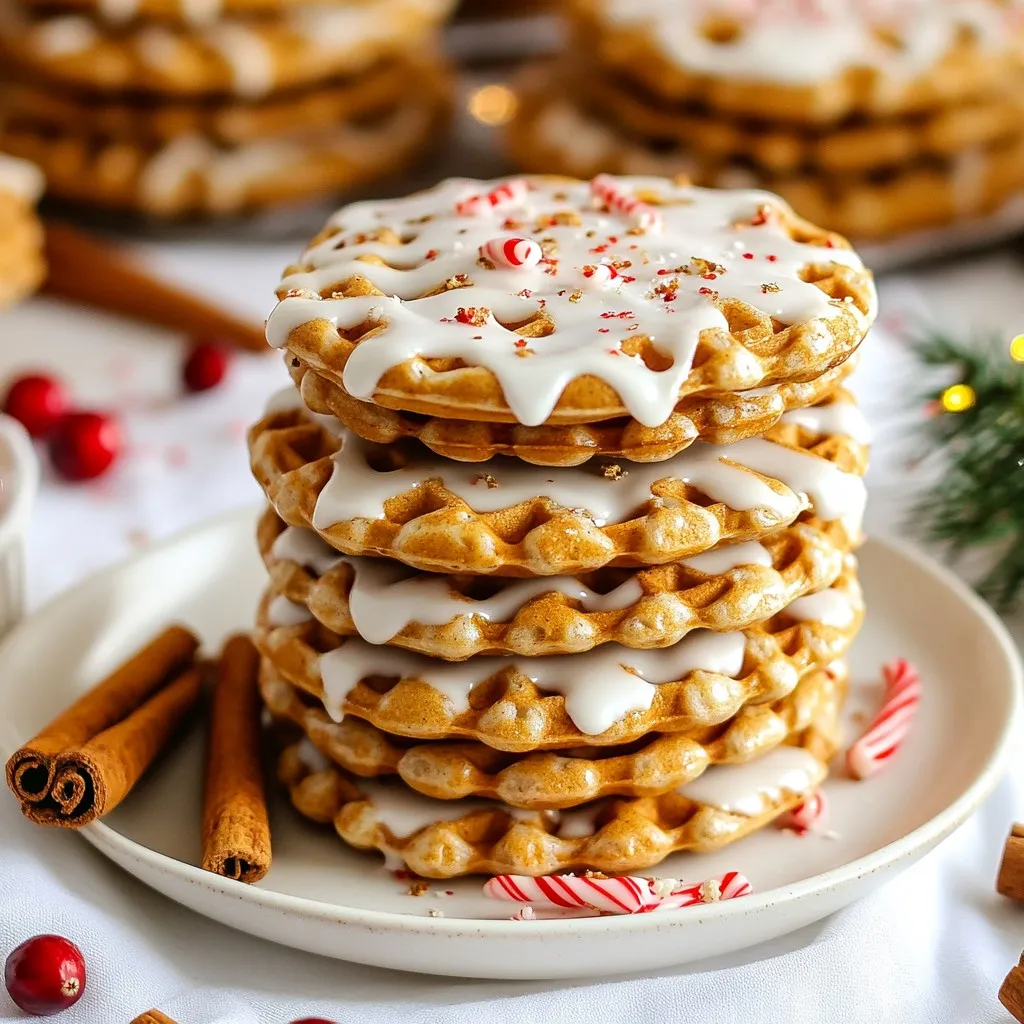 Stapeln Sie die Waffelkekse auf einem festlichen Teller und servieren Sie dazu eine kleine Schüssel mit extra Glasur zum Eintunken. Dekorieren Sie den Teller mit Zimtstangen und frischen Preiselbeeren für eine festliche Note!