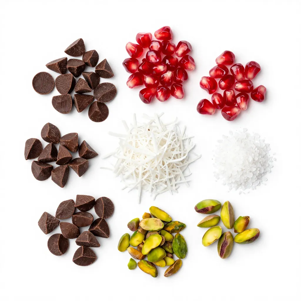 Jetzt kommt der aufregende Teil! Während die Schokolade noch warm ist, streuen Sie die Toppings darauf. Verteilen Sie eine Tasse Granatapfelkerne, eine halbe Tasse geriebene Kokosnuss und eine viertel Tasse gehackte Pistazien gleichmäßig. Drücken Sie die Toppings leicht in die Schokolade, damit sie haften bleiben.