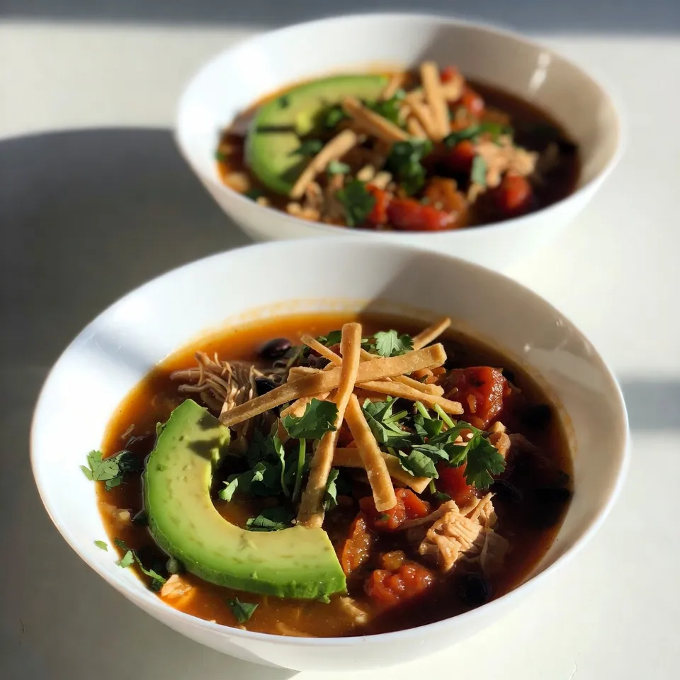 Hühnerbrühe und Hühnchen machen die Suppe herzhaft. Die schwarzen Bohnen und der Mais fügen eine tolle Textur hinzu. Die Limette bringt eine frische Note, während die Garnituren die Suppe schön aussehen lassen.