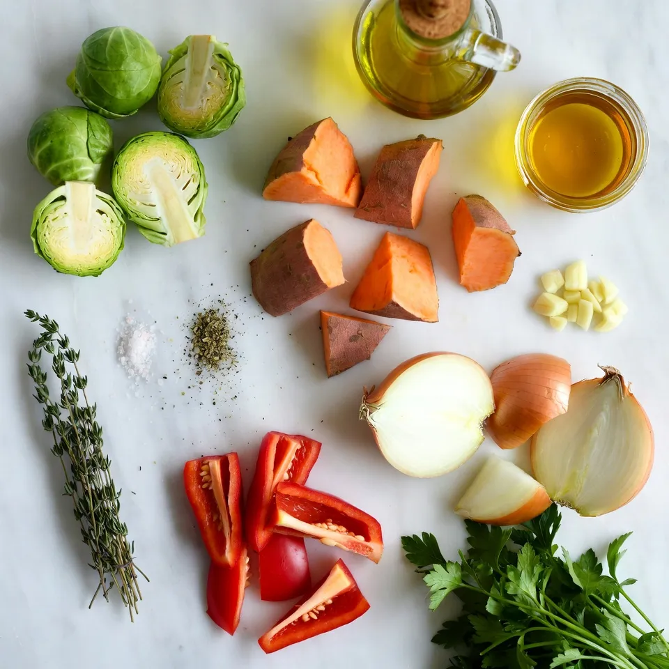 In einer großen Schüssel vermenge die halbierten Rosenkohl, die gewürfelte Süßkartoffel, die gehackte rote Paprika und die geviertelte Zwiebel gründlich.