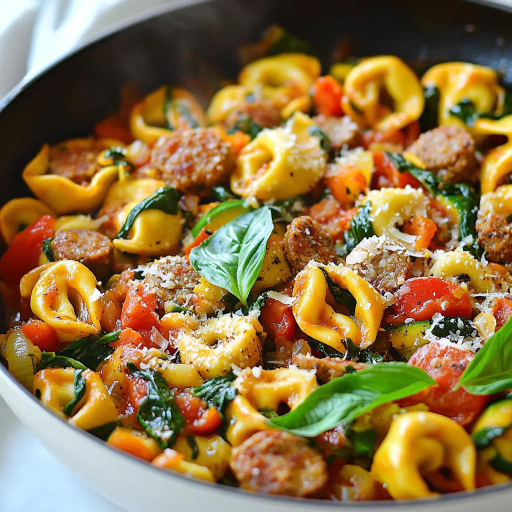 Ein köstliches und einfaches Gericht mit Käsetortellini, italienischer Wurst und frischem Gemüse.