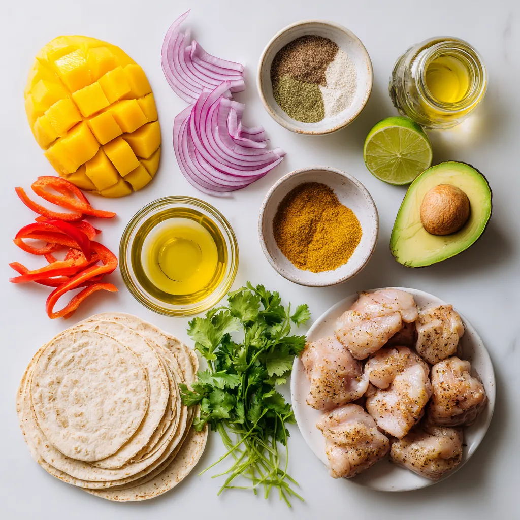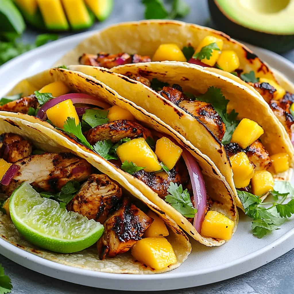 Leckere Tacos mit würzigem Jerk-Hähnchen, frischer Mango und Avocado.