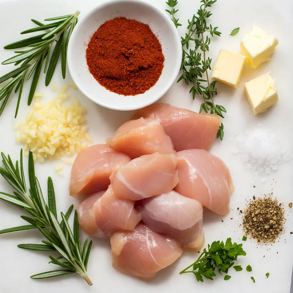 Die genauen Mengen sind wichtig. Sie helfen, das richtige Gleichgewicht von Aromen zu erreichen. Für vier Portionen sind 500g Hähnchenbrust perfekt. Verwende 4 Esslöffel Butter, um die Hähnchenbisse saftig zu machen. Der Knoblauch bringt viel Geschmack. Vier Zehen sind ideal für einen kräftigen Geschmack. Frische Kräuter wie Rosmarin und Thymian geben ein tolles Aroma. Eine Teelöffel geräuchertes Paprika-Pulver sorgt für eine feine Note.