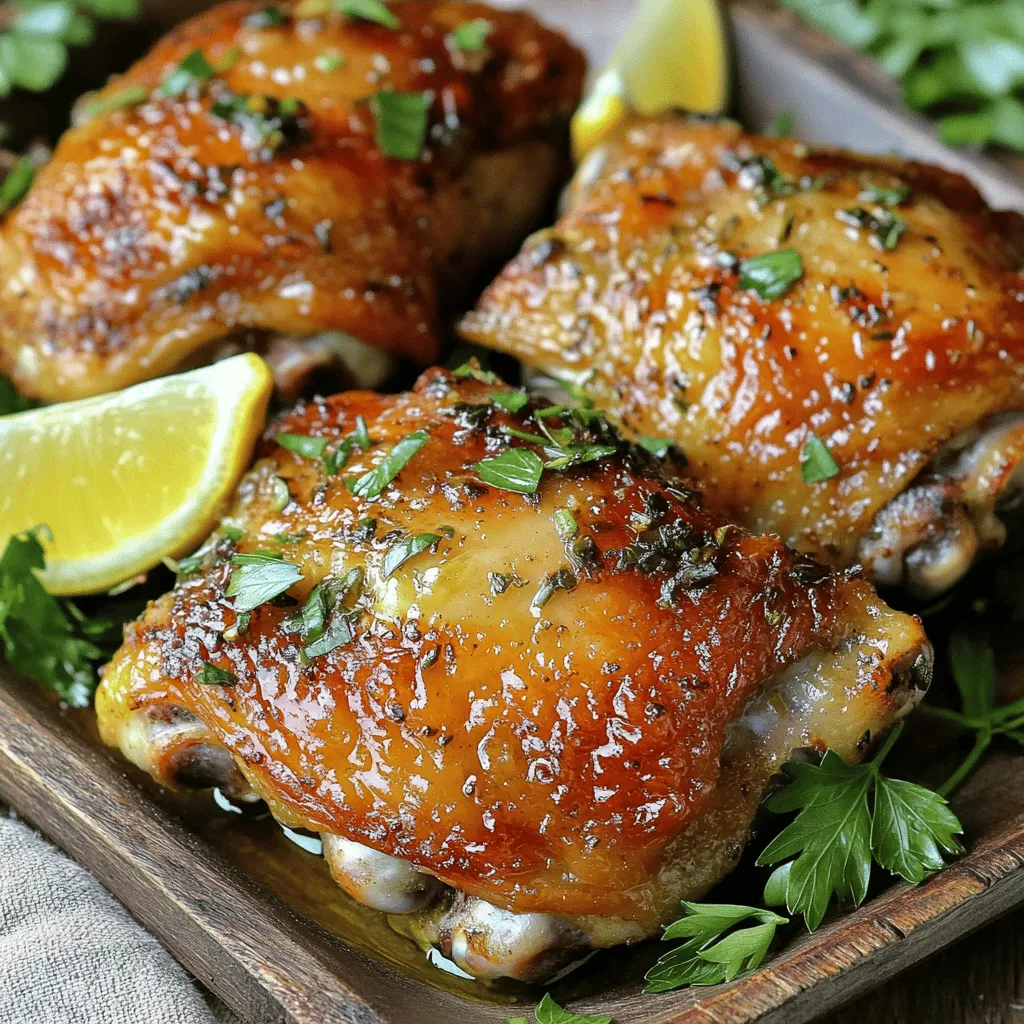 - 4 Hähnchenschenkel mit Knochen und Haut - 4 Knoblauchzehen, gehackt - Frische Kräuter: Rosmarin, Thymian, Petersilie - 1 Zitrone (Schale und Saft) - 3 Esslöffel Olivenöl - Gewürze: Salz, schwarzer Pfeffer, Paprika (optional) In diesem Rezept sind die Hauptzutaten sehr wichtig. Die Hähnchenschenkel geben dem Gericht saftigen Geschmack. Knoblauch und frische Kräuter bringen viel Aroma. Ich benutze oft Rosmarin, Thymian und Petersilie. Diese Kräuter passen wunderbar zum Hähnchen. Die Marinade ist der Schlüssel zu zartem Hähnchen. Die Zitrone gibt Frische. Olivenöl sorgt für eine schöne Bräunung. Salz und Pfeffer bringen den Geschmack hervor. Paprika gibt eine schöne Farbe, wenn du es magst. Wenn du die Zutaten bereit hast, wird das Kochen einfach und schnell. Du wirst begeistert sein von dem tollen Geschmack. Heize deinen Ofen auf 220 °C (425 °F) vor. Dies ist wichtig, um die Hähnchenschenkel knusprig zu machen. In einer kleinen Schüssel mische 3 Esslöffel Olivenöl, 4 gehackte Knoblauchzehen, 2 Esslöffel frischen Rosmarin, 2 Esslöffel frischen Thymian und 1 Esslöffel frische Petersilie. Füge die abgeriebene und ausgepresste Zitrone hinzu. Gib Salz, schwarzen Pfeffer und optional 1 Teelöffel Paprika dazu. Jetzt tupfe die Hähnchenschenkel mit Küchenpapier trocken. Dies hilft, die Haut knusprig zu machen. Würze die Schenkel großzügig mit Salz und Pfeffer. Lege die Hähnchenschenkel in eine große Schüssel oder einen Beutel. Gieße die Marinade darüber. Stelle sicher, dass jeder Schenkel gut bedeckt ist. Lasse das Hähnchen mindestens 30 Minuten bei Raumtemperatur marinieren. Du kannst es auch bis zu 4 Stunden im Kühlschrank lassen, um den Geschmack zu intensivieren. Ordne die marinierten Hähnchenschenkel mit der Hautseite nach oben in eine Auflaufform. Röste die Hähnchenschenkel im vorgeheizten Ofen für 35-40 Minuten. Sie sind fertig, wenn sie goldbraun sind und eine Innentemperatur von 75 °C (165 °F) erreichen. Nehme das Hähnchen aus dem Ofen. Lass es 5 Minuten ruhen, bevor du es servierst. Dies hilft, die Säfte zu erhalten. Serviere die Hähnchenschenkel auf einer großen Platte, garniert mit frischen Kräutern und Zitronenschnitzen. Träufle etwas Bratensaft darüber für mehr Geschmack. Um die beste Haut zu bekommen, tupfen Sie das Hähnchen vor dem Marinieren trocken. Feuchtigkeit verhindert, dass die Haut knusprig wird. Verwenden Sie frische Kräuter für intensiven Geschmack. Rosmarin, Thymian und Petersilie bringen frische Aromen. Diese Kräuter sind einfach zu finden und machen einen großen Unterschied. Die Präsentation zählt! Servieren Sie die Hähnchenschenkel auf einer großen Platte. Garnieren Sie sie mit frischen Kräutern und Zitronenschnitzen. Das bringt Farbe und macht das Gericht ansprechend. Träufeln Sie etwas Bratensaft darüber für zusätzlichen Geschmack. Für Beilagen passen Ofengemüse oder ein frischer Salat gut dazu. Diese Beilagen ergänzen den Geschmack der Hähnchenschenkel und sorgen für ein ausgewogenes Mahl. {{image_4}} Du kannst dein Hähnchen mit anderen Kräutern aufpeppen. Oregano gibt einen tollen Geschmack. Basilikum bringt eine süße Note. Beide Kräuter passen gut zu Knoblauch. Wenn du gerne etwas Schärfe magst, probiere rote Paprikaflocken. Ein wenig Cayennepfeffer kann auch Spaß machen. Diese Gewürze bringen mehr Tiefe in das Gericht. Du kannst deine Marinade ganz nach deinem Geschmack anpassen. Es gibt viele Wege, Hähnchenschenkel zuzubereiten. Eine beliebte Methode ist das Grillen. Grillen gibt dem Hähnchen einen rauchigen Geschmack und eine knusprige Haut. Du kannst die Hähnchenschenkel einfach marinieren und dann auf den Grill legen. Achte darauf, sie regelmäßig zu wenden. Eine andere Methode ist die Verwendung eines Slow Cookers. Diese Technik macht das Hähnchen sehr zart. Du musst es einfach nur marinieren und in den Slow Cooker geben. Bei niedriger Temperatur garen die Aromen gut durch. So hast du köstliches Hähnchen ohne viel Aufwand. Kühlschrank: Wie lange bleibt das Hähnchen frisch? Das Hähnchen bleibt im Kühlschrank etwa 3 bis 4 Tage frisch. Stellen Sie sicher, dass es in einem luftdichten Behälter aufbewahrt wird. So bleibt der Geschmack erhalten. Anleitung für das Einfrieren der Hähnchenschenkel Um die Hähnchenschenkel einzufrieren, lassen Sie sie zuerst abkühlen. Wickeln Sie sie dann gut in Frischhaltefolie ein und legen Sie sie in einen Gefrierbeutel. So können Sie sie bis zu 3 Monate aufbewahren. Beschriften Sie den Beutel mit dem Datum. Beste Methoden zum Aufwärmen, um die Textur zu erhalten Um die Hähnchenschenkel aufzuwärmen, nutzen Sie den Ofen. Heizen Sie ihn auf 180 °C vor. Legen Sie die Schenkel auf ein Backblech und decken Sie sie mit Folie ab. So bleibt die Haut knusprig. Erwärmen Sie sie für etwa 20 Minuten. Prüfen Sie die Innentemperatur. Sie sollte 75 °C erreichen. Alternativ können Sie auch eine Mikrowelle nutzen, aber die Haut wird nicht knusprig. Sie sollten das Hähnchen mindestens 30 Minuten marinieren. Das gibt den Aromen Zeit, in das Fleisch einzudringen. Für den besten Geschmack empfehle ich, es bis zu 4 Stunden im Kühlschrank zu marinieren. So wird das Hähnchen besonders zart und geschmackvoll. Wenn Sie wenig Zeit haben, ist auch eine kürzere Marinierzeit in Ordnung, aber mehr Zeit bringt mehr Geschmack. Ja, Sie können das Rezept leicht anpassen. Wenn Sie glutenfrei kochen, verwenden Sie glutenfreies Olivenöl. Für milchfreie Alternativen können Sie die Marinade ohne Butter oder Sahne zubereiten. Die frischen Kräuter geben viel Geschmack, also lassen Sie diese nicht weg. Sie können auch andere Kräuter wie Oregano oder Basilikum verwenden. Seien Sie kreativ! Um sicherzustellen, dass das Hähnchen durchgegart ist, prüfen Sie die Innentemperatur. Diese sollte 75 °C (165 °F) erreichen. Ein Fleischthermometer macht dies einfach. Stecken Sie es in den dicksten Teil des Schenkels. Wenn die Temperatur stimmt, ist es fertig. Achten
