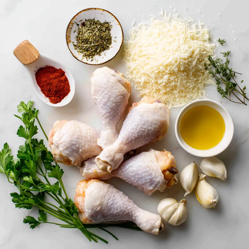Hauptzutaten für Knoblauch Parmesan Hähnchenschenkel