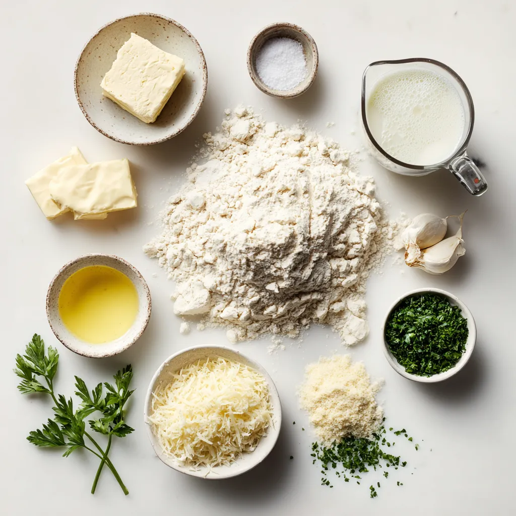 Für unser Knoblauch Parmesan Zupfbrot sind die Hauptzutaten wichtig. Weizenmehl gibt dem Brot den Körper. Trockenhefe bringt es zum Aufgehen. Zucker hilft der Hefe, aktiv zu werden. Salz gibt Geschmack. Warme Milch macht den Teig weich. Geschmolzene Butter fügt einen reichen Geschmack hinzu.