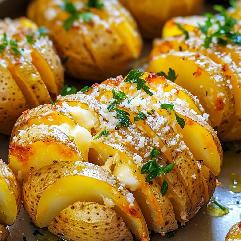 Lege die eingeschnittenen Kartoffeln auf ein Backblech mit Backpapier. Bestreiche die Einkerbungen und die Oberseite jeder Kartoffel mit der Knoblauch-Butter-Mischung. Streue den frisch geriebenen Parmesan gleichmäßig darüber. Backe die Kartoffeln für 45-50 Minuten. Sie sollten außen knusprig und innen zart sein. Nach etwa der Hälfte der Zeit kannst du etwas übrig gebliebene Butter auf die Kartoffeln geben, um den Geschmack zu verstärken. Lass die Kartoffeln nach dem Backen kurz abkühlen und garniere sie mit Petersilie.