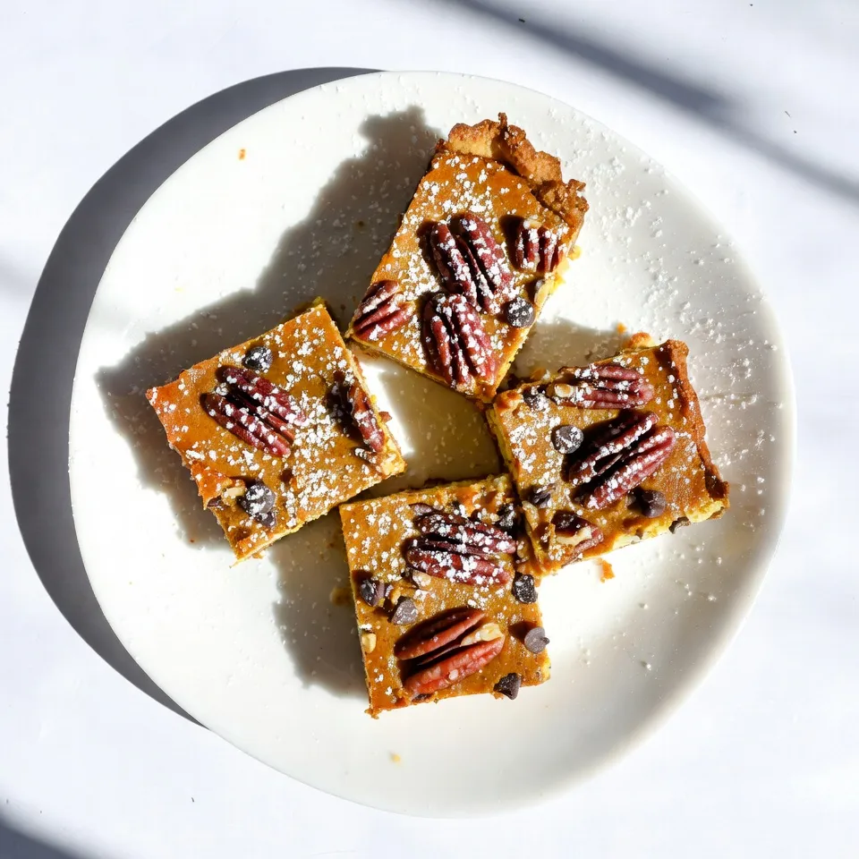 In einer großen Schüssel verquirle 1 Tasse Kürbispüree, 1 Tasse gesüßte kondensierte Milch, ½ Tasse weißen Zucker, 2 große Eier, 1 Teelöffel Vanilleextrakt, 1 Teelöffel gemahlenen Zimt, ½ Teelöffel gemahlene Muskatnuss, ½ Teelöffel gemahlenen Ingwer und ½ Teelöffel Salz. Rühre, bis die Mischung glatt ist. Füge 1 Tasse grob gehackte Pekannüsse und eventuell ½ Tasse Mini-Schokoladenstückchen hinzu. Gieße die Füllung gleichmäßig über den vorgebackenen Boden. Backe die Riegel für 25-30 Minuten. Sie sind bereit, wenn ein Zahnstocher sauber herauskommt. Lass sie komplett abkühlen und kühl sie dann 1-2 Stunden im Kühlschrank. Schneide die Riegel nach dem Kühlen in Stücke. Serviere sie gekühlt oder bei Raumtemperatur.