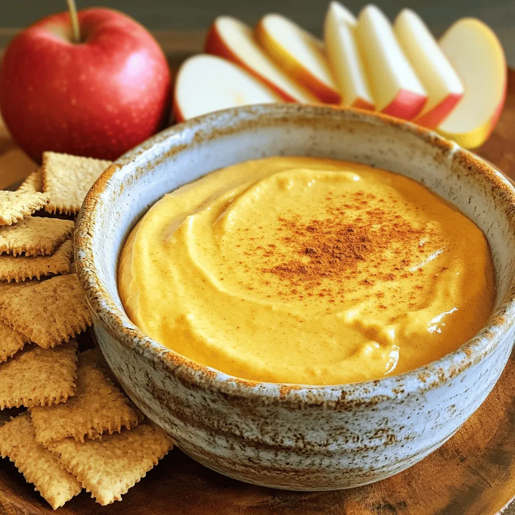 Präsentationstipps: Garnieren Sie den Dip mit einer Prise Kürbiskuchengewürz oder einer kleinen Menge schlagfertiger Creme auf der Oberseite für einen dekorativen Touch.