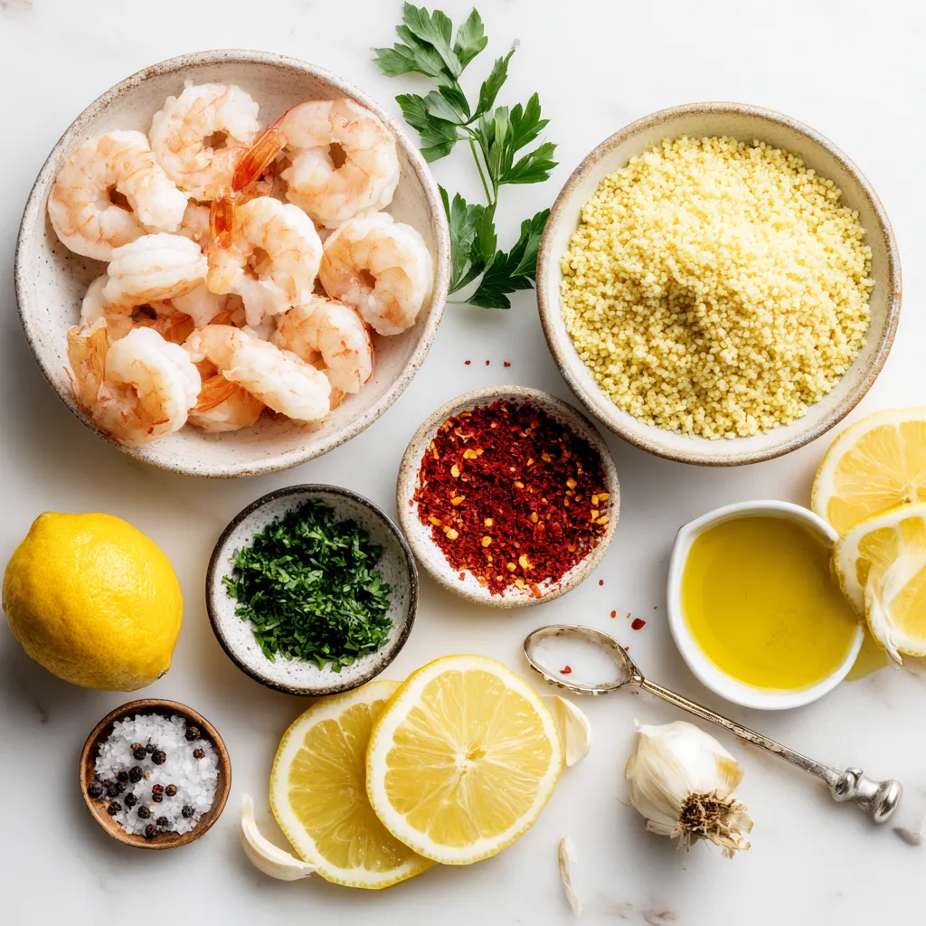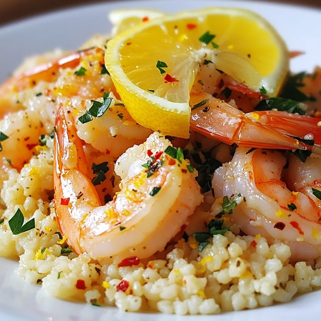 Ein köstliches Gericht mit Garnelen, Couscous und einer frischen Zitronen-Knoblauch-Sauce.