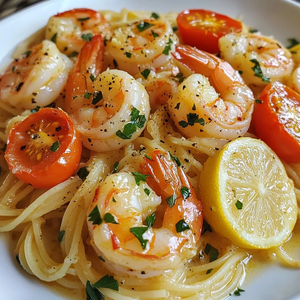 Ein köstliches Gericht mit Garnelen, Knoblauch und Zitrone, serviert mit Linguine oder Spaghetti.