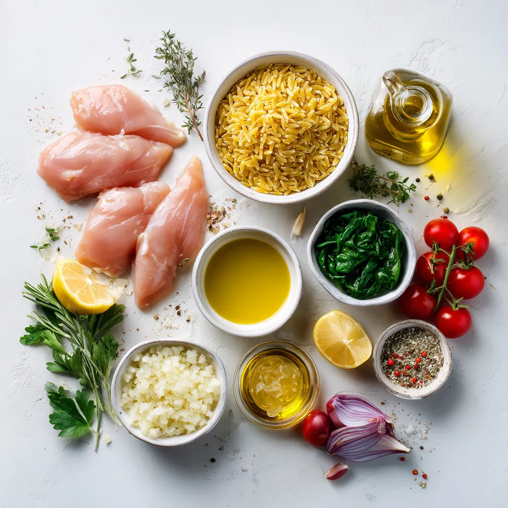 Zuerst schneiden Sie 450 g Hähnchenbrust in kleine Stücke. Dann würfeln Sie eine kleine Zwiebel und hacken drei Knoblauchzehen. Die Zubereitung ist einfach, aber wichtig. Vergessen Sie nicht, 1 Tasse Orzo-Nudeln bereitzustellen. Messen Sie auch 500 ml Hühnerbrühe ab. Für den frischen Geschmack brauchen Sie die Schale und den Saft von einer Zitrone. Schließlich wiegen Sie 1 Tasse grob gehackten Spinat und 1/4 Tasse frische, gehackte Petersilie.