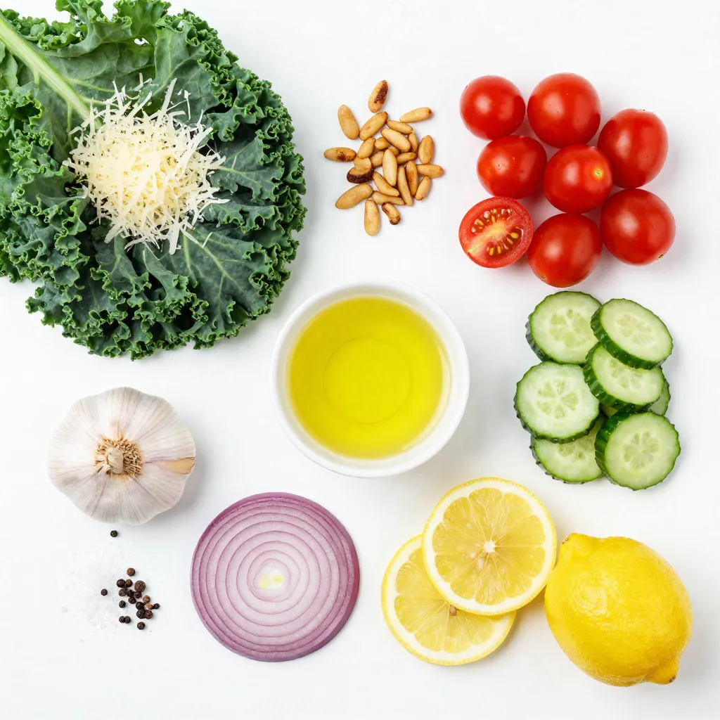Der Grünkohl ist die Hauptzutat in diesem Salat. Ich wähle frischen Grünkohl aus, der knackig und grün ist. Entferne die harten Stiele und hacke die Blätter grob. Das macht den Grünkohl zarter. Cherrytomaten bringen süße Frische. Sie sind klein und einfach zu halbiere. Für die Gurke nehme ich eine knackige Sorte. Ich würfle sie, um die Textur zu verbessern. Die rote Zwiebel fügt einen schönen Geschmack hinzu. Ich schneide sie dünn, damit sie nicht zu scharf schmeckt.