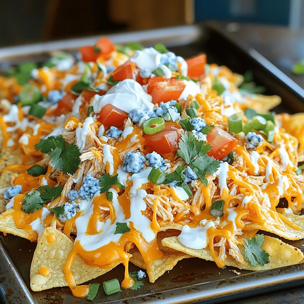 Du kannst deine Loaded Buffalo Chicken Nachos leicht anpassen. Ein beliebtes Rezept sind BBQ-Hühnchen-Nachos. Ersetze einfach die Buffalo-Sauce durch deine Lieblings-BBQ-Sauce. Das gibt den Nachos eine süßliche Note.