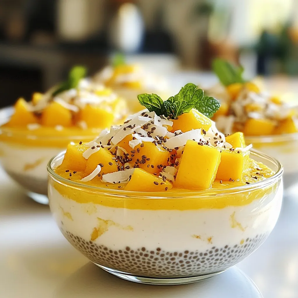 Die Präsentation macht viel aus. Serviere den Pudding in klaren Gläsern. So kannst du die schönen Schichten sehen. Garniere ihn mit zusätzlichen Mangostücken und einem Minzstängel obenauf. Das sieht nicht nur toll aus, sondern gibt auch ein frisches Aroma. Eine Prise geröstete Kokosflocken bringt das tropische Gefühl in dein Dessert.