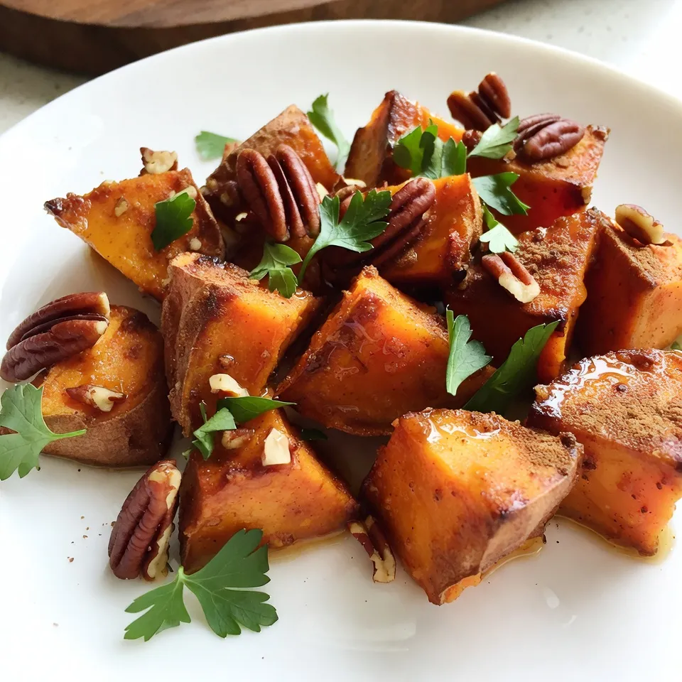 Ein köstliches Gericht aus gerösteten Süßkartoffeln mit Ahornsirup und Zimt.