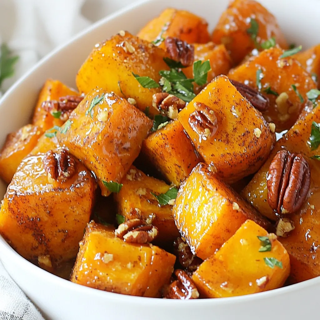 Serviere die gerösteten Süßkartoffeln in einer schönen Schüssel und bestreue sie vor dem Servieren mit zusätzlichen Pekannüssen und Petersilie für einen einladenden Look.