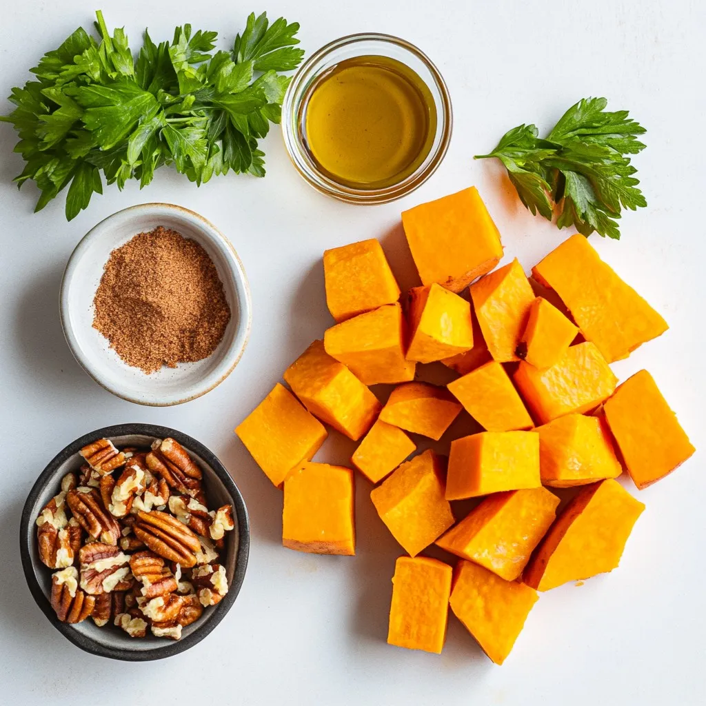 Um köstliche Ahorn-Zimt geröstete Süßkartoffeln zuzubereiten, benötigst du ein paar einfache Zutaten. Beginne mit 4 mittelgroßen Süßkartoffeln. Diese sind süß und nahrhaft. Du schälst sie und würfelst sie in gleichmäßige Stücke.