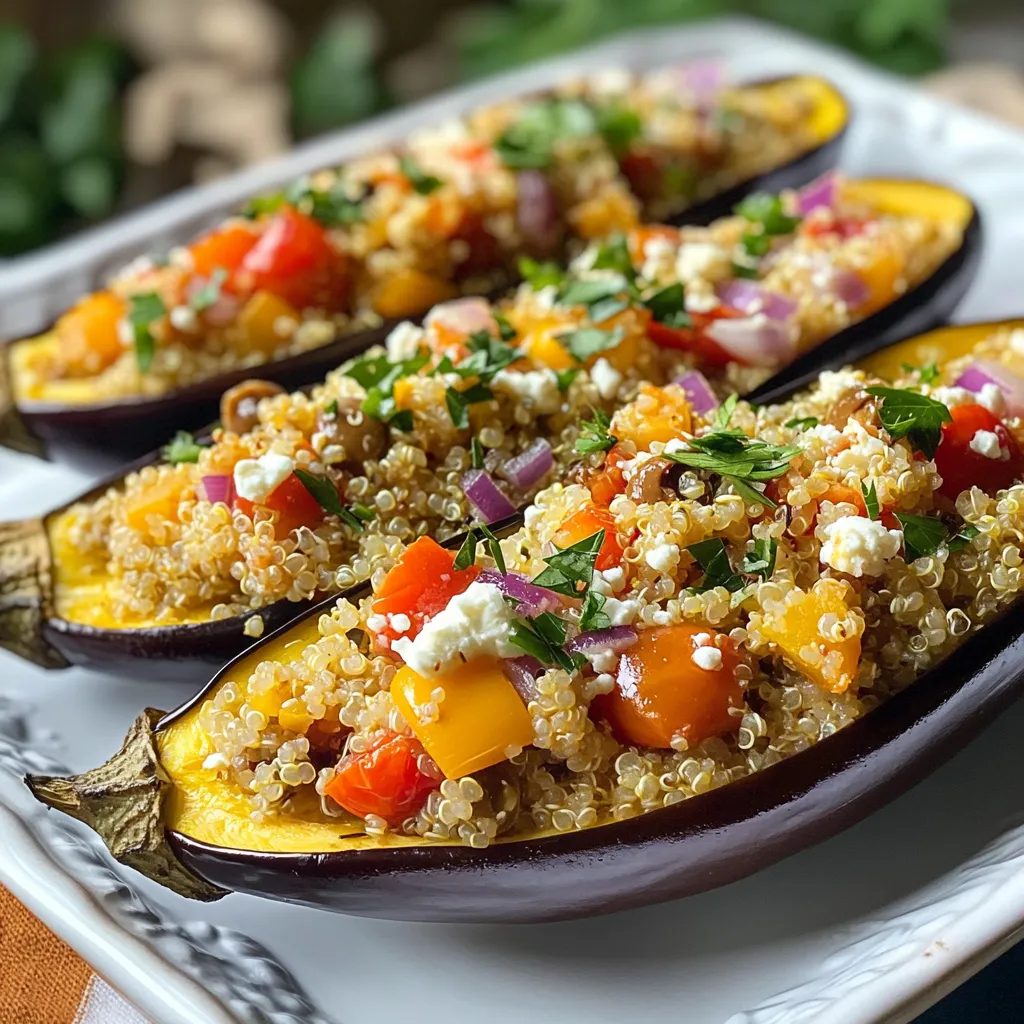 Eine köstliche und gesunde Füllung aus Quinoa, Gemüse und Feta in Auberginenhälften.