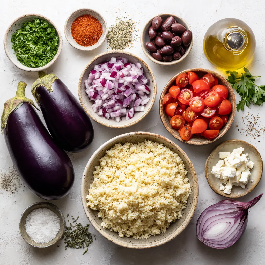 Hauptzutaten für Mediterrane gefüllte Auberginen