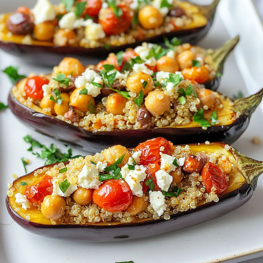 Ein köstliches Gericht mit Auberginen, gefüllt mit Quinoa, Kichererbsen und Feta.