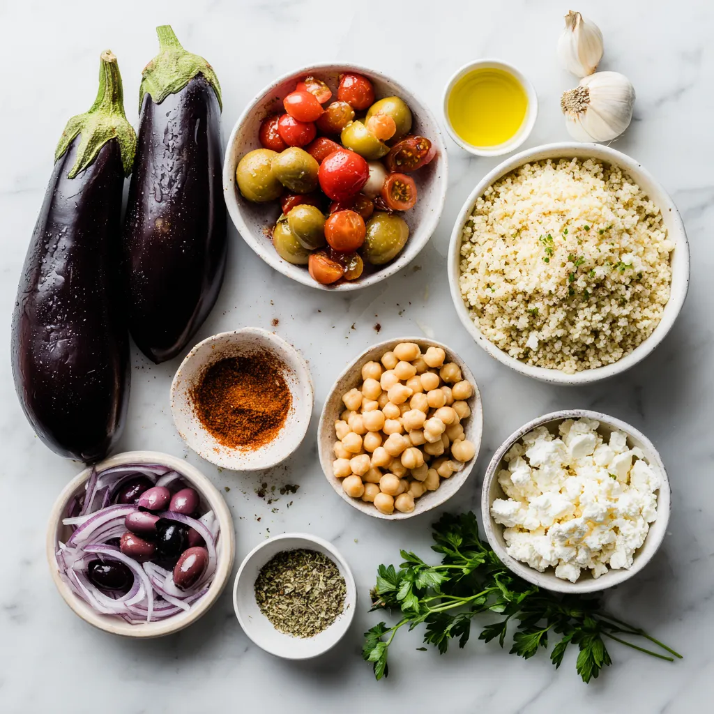 Die Hauptzutaten für diese gefüllten Auberginen sind frisch und bunt. Auberginen sind die Basis. Sie geben der Füllung Struktur und Geschmack. Kirschtomaten fügen Süße hinzu. Der Quinoa bringt eine nussige Note und ist proteinreich. Kichererbsen sorgen für eine schöne Textur und machen das Gericht sättigend.