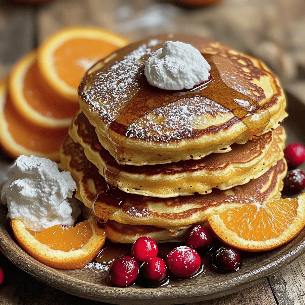 Präsentiere die Pfannkuchen schön gestapelt auf einem großen Teller. Träufle Ahornsirup darüber und bestreue sie mit extra Cranberries und Puderzucker. Für ein festliches Aussehen kannst du Orangenstücke oder einen Klecks Schlagsahne hinzufügen. Serviere sie mit einer Tasse frischem Obst oder Joghurt für eine ausgewogene Mahlzeit.